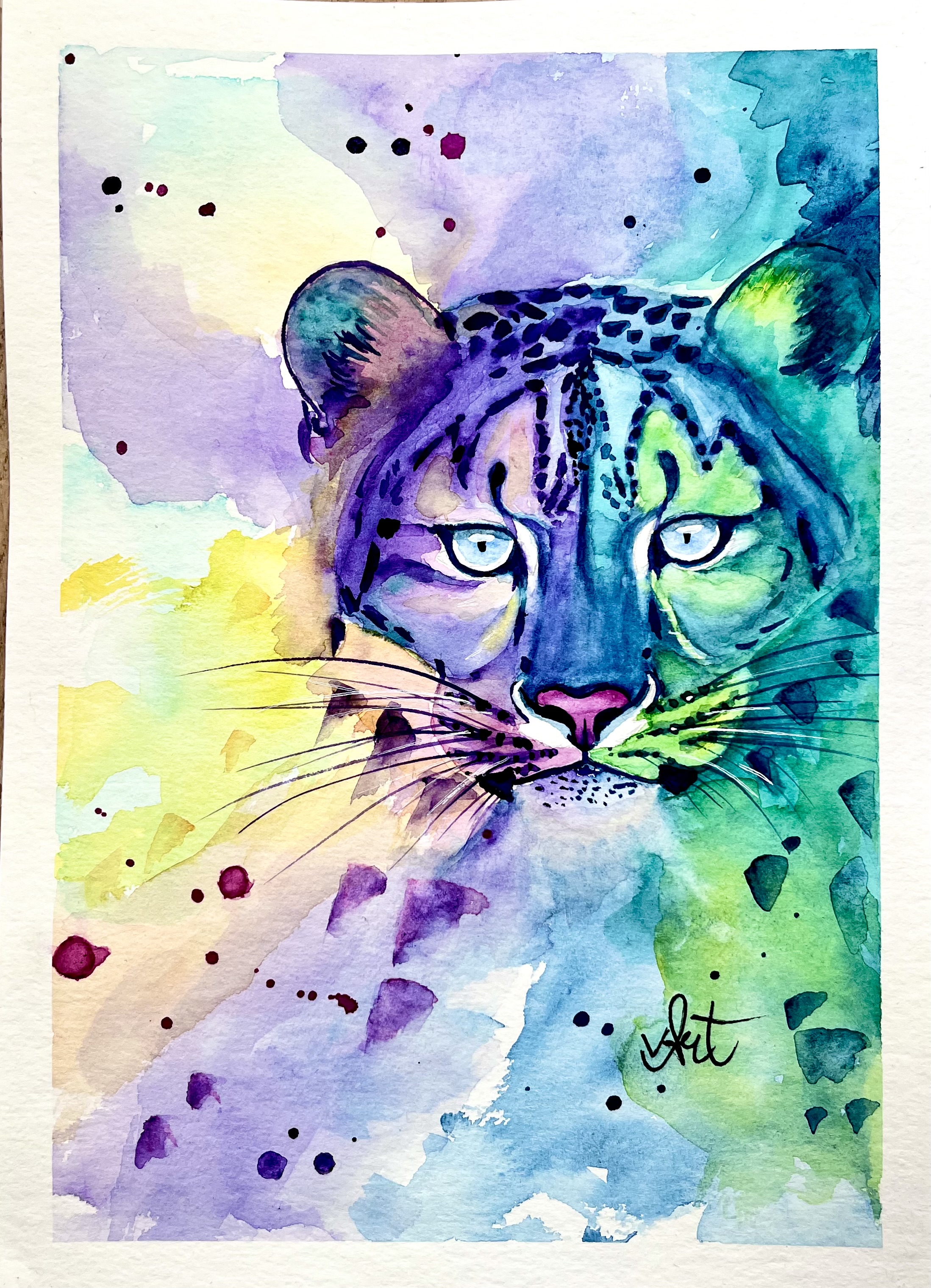 Ein Unikat in Aquarell: das Gesicht eines Schneeleoparden mit Fell in kühlsen fein abgestimmten Farben auf weißem Papier.